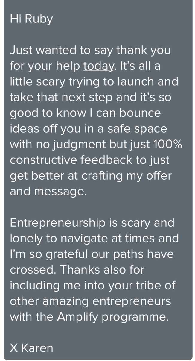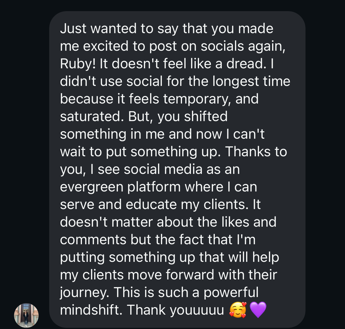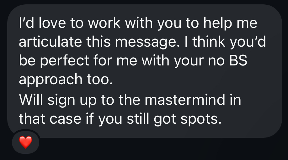 “Before working with Ruby, I was posting constantly but getting nowhere. people said they loved my content, but no one was actually buying. Now my message is crystal clear. I know exactly what to say to connect with buyers, and I’ve had multiple clients reach out straight from my posts, which literally rarely happened prior to doing this work around messaging"